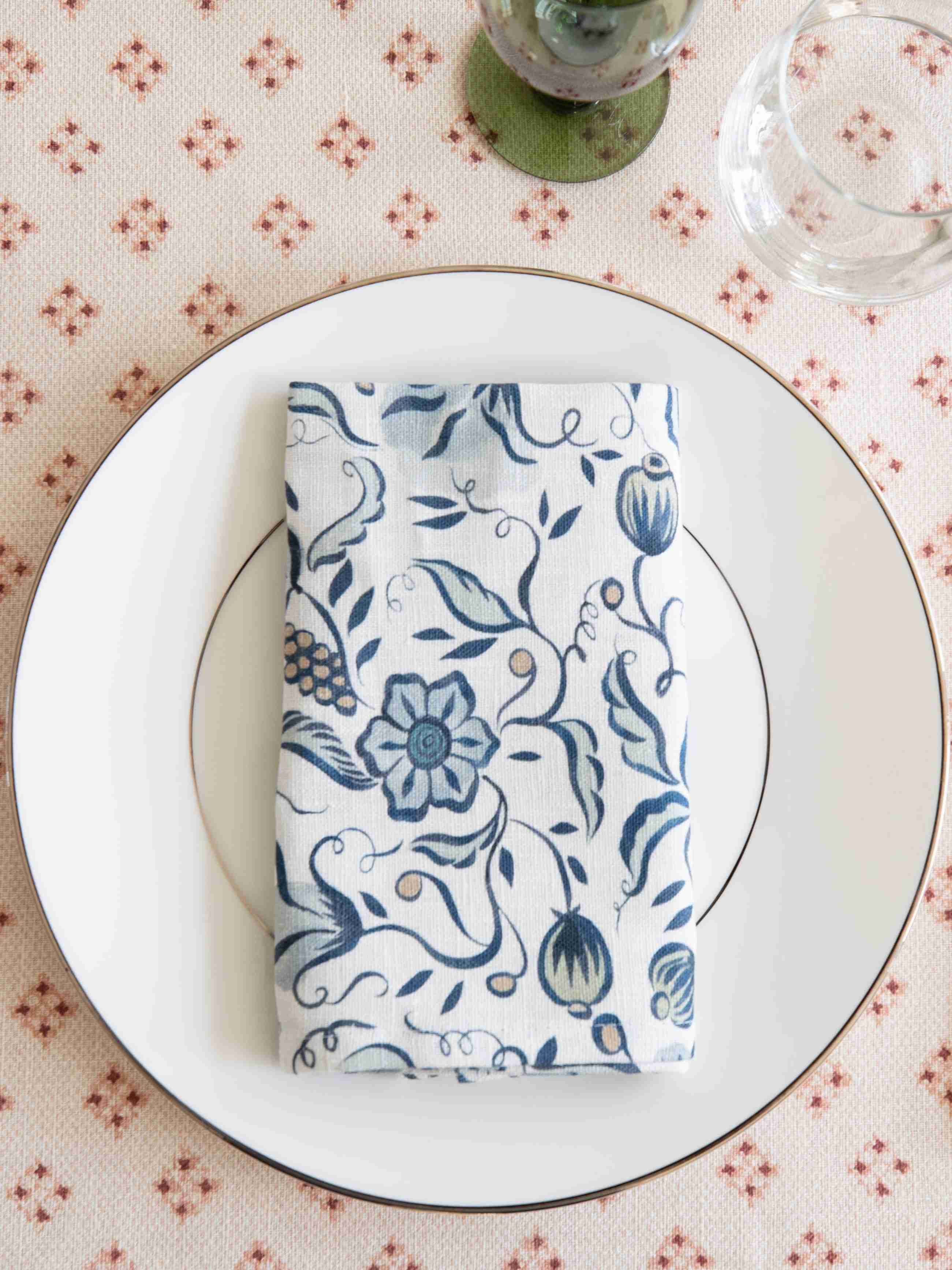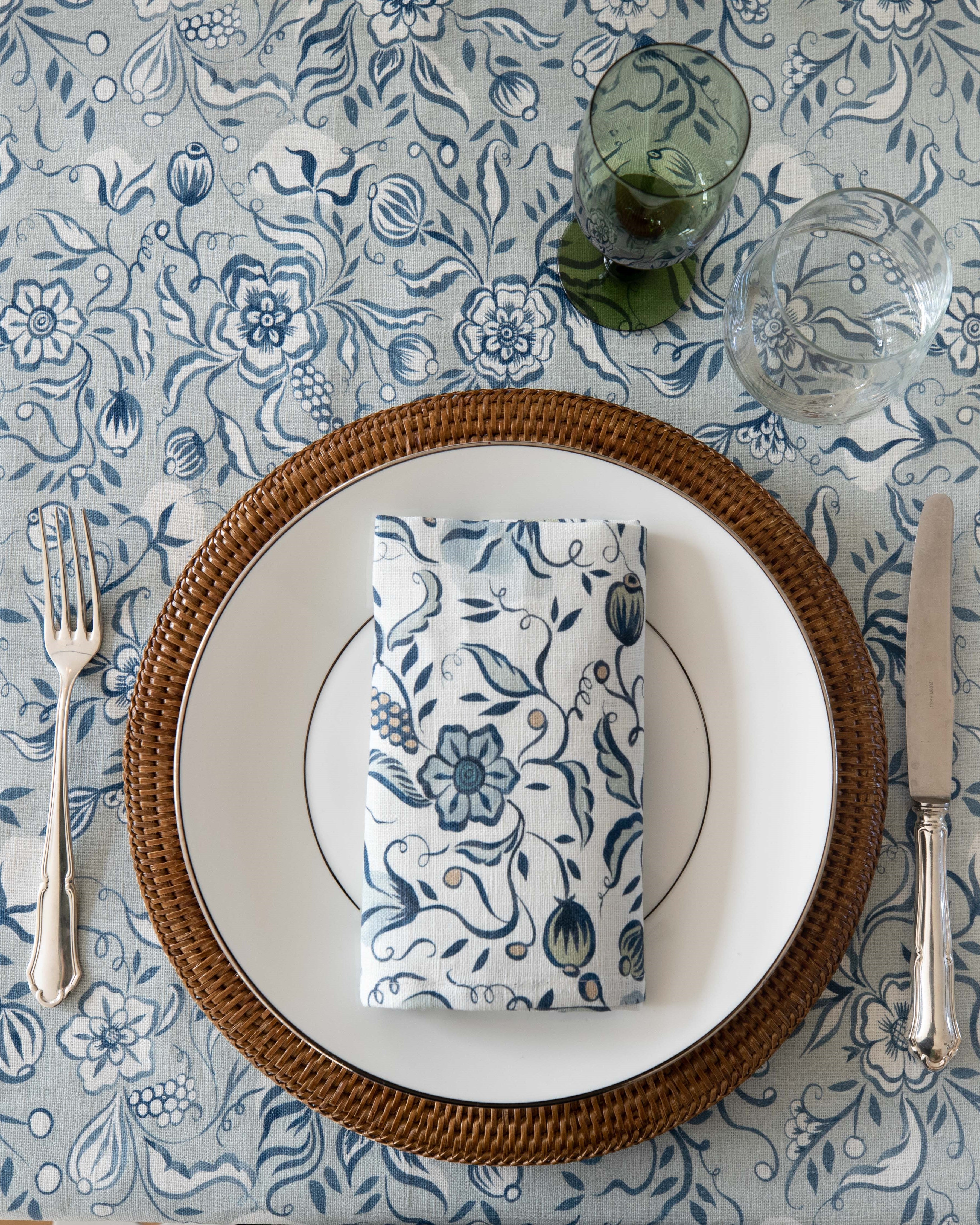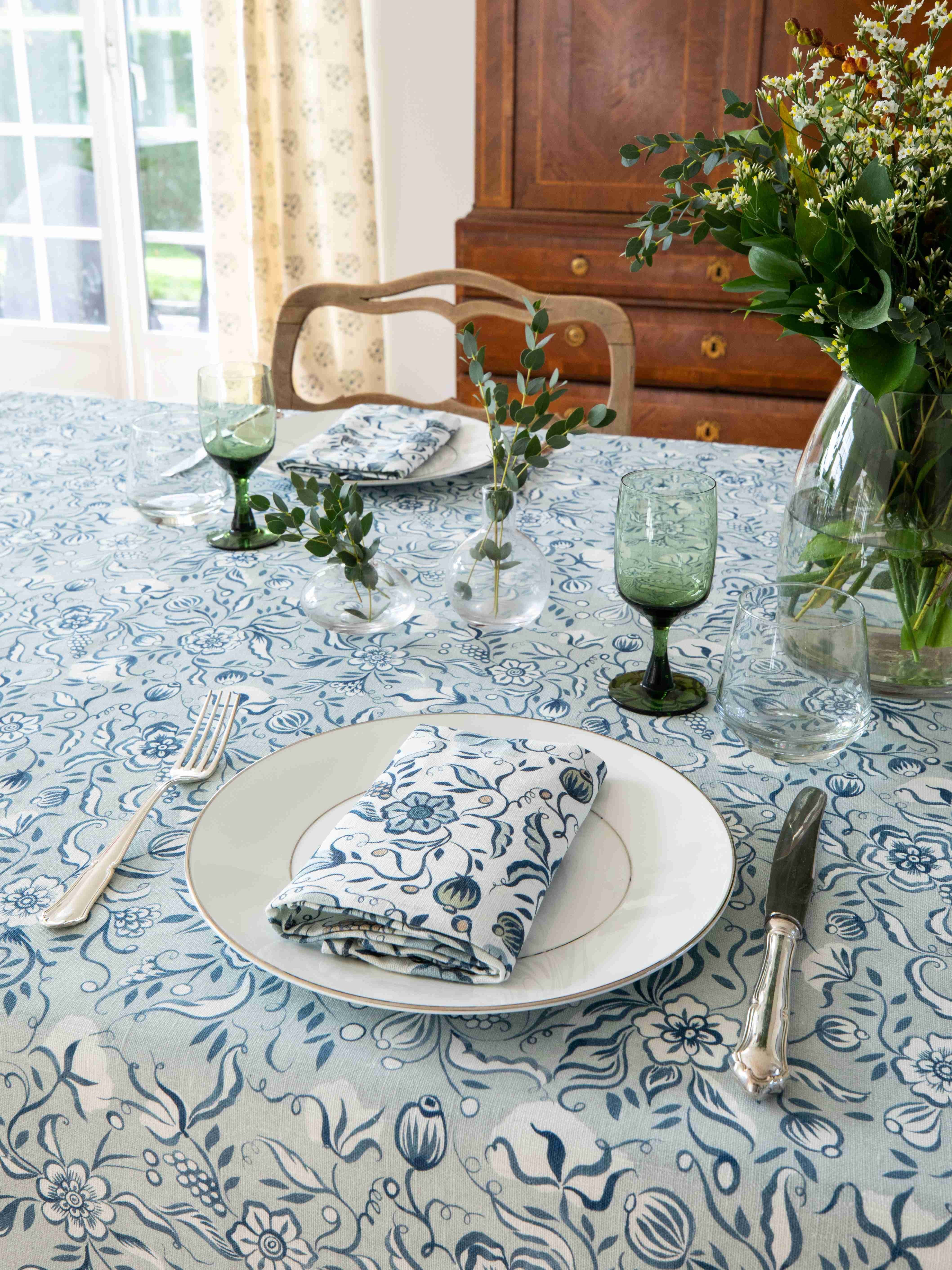 Decorate your dining table in blue and white with a twist. Sustainably sourced OEKO-TEX linen fabric, the Uvdal Spring features traditional Norwegian folk art inspired by the rosemaling seen on the walls of the 1650s Uvdal stave church.
