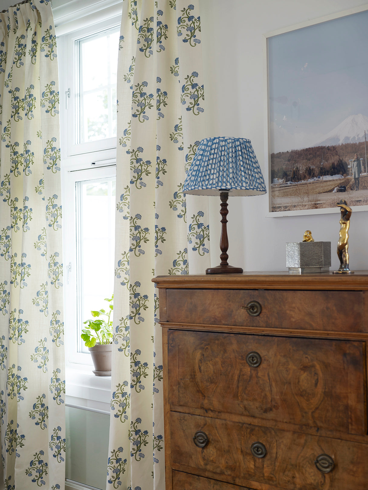 The inspiration for this beautiful textile design was a motif found on a traditional chest dating from the 1830s in Telemark in Norway. Traditionally chests were made, and decorated with art form called Rosemaling, as a present for young women before getting married. This pattern is named after, and honouring Gyri’s grandmother, Anne, who has been a great inspiration to her.